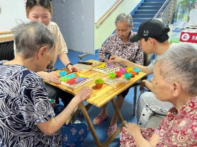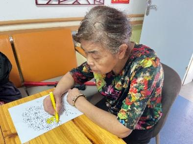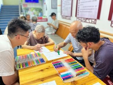 在交流环节结束后,实践团成员们与老人们一起开展了手工制作活动。在工作人员的建议下,志愿者们和老人们共同制作了简单的图画,还参与了一些小游戏。这些手工活动不仅有助于提升老人们的动手能力和认知功能,还激发了他们的创造力和想象力。通过参与这些活动,老人们能够增强社交互动,缓解孤独感和抑郁情绪,获得成就感和自信心。集中注意力的过程也有助于维持他们的心理健康。