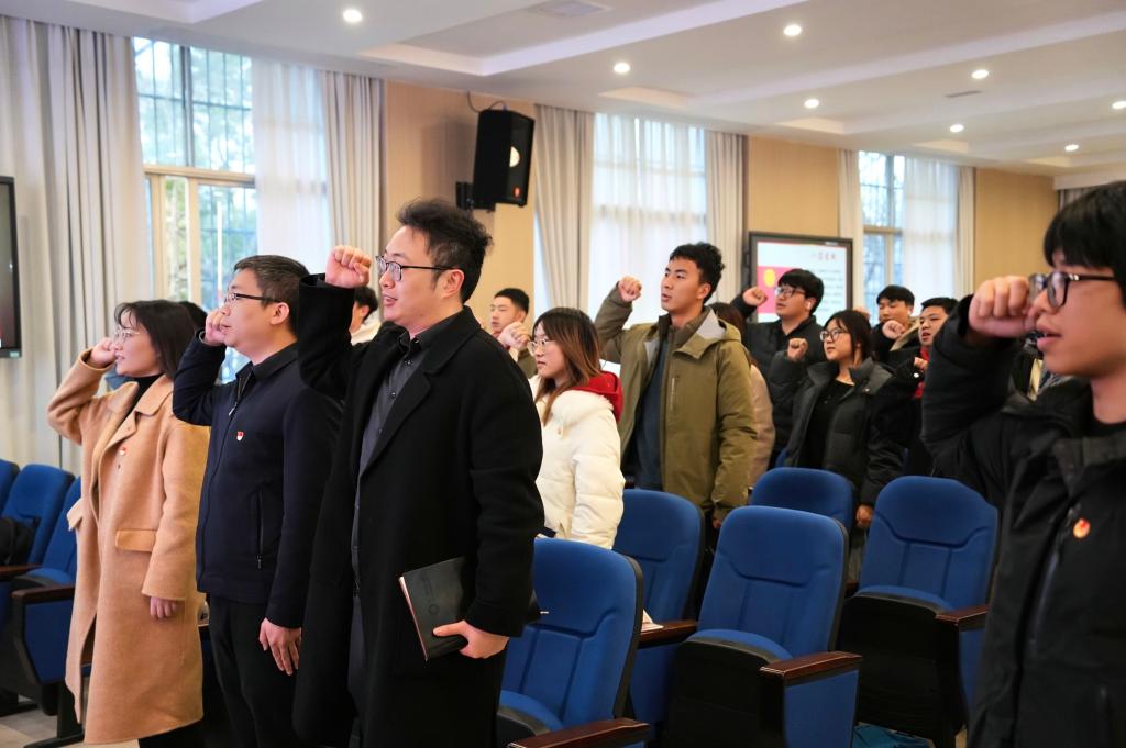 会议尾声,全体团员重温入团誓词:“我志愿加入中国共产主义青年团……为共产主义事业而奋斗!”让团员们再次明确入团时的责任与使命,强化身份认同与集体意识。