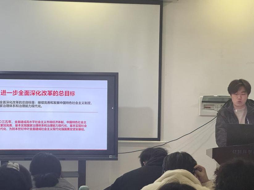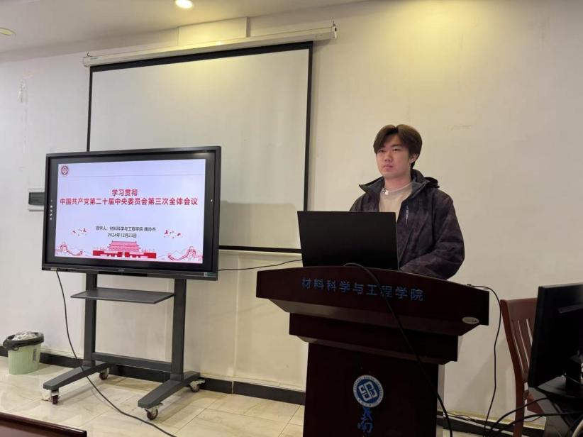 随后,员工会主席魏帅杰结合员工群体的特点,以生动鲜活的案例,对全会中关于科技自立自强的论述进行深入浅出的讲解。魏帅杰鼓励同学们积极投身科研实践,努力攻克材料领域的“卡脖子” 难题,为我国材料学科的发展贡献青春力量。