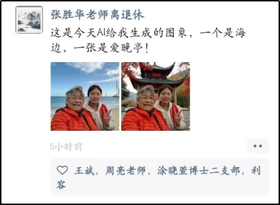 活动虽已落幕,但温暖仍在延续。当晚,辅导员陈少华老师在朋友圈刷到了离退休处张胜华老师的分享。屏幕上展示着两张由AI生成的精美图片——一幅是碧海蓝天的壮阔景象,另一幅则是秋意盎然的爱晚亭。张老师配文道:“这是今天AI给我生成的图像!”这寥寥数语,朴实无华,却胜过千言万语,是对那位帮助他解锁新技能的志愿者同学最直接的感谢,更是对所有为本次活动倾情付出的老师和同学们最温暖、最有力的认可与褒奖。员工们的劳动付出,收获了真实而温暖的社会回响。