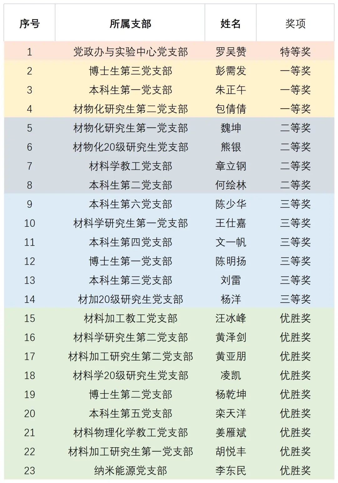 经过激烈的角逐,来自党政办与实验中心党支部的罗吴赞《以党的二十大精神为指引,到基层去奏响青春的赞歌》荣获特等奖,该微党课结合自身“党性在上,心态适中,干在当下”的基层工作经历,呼吁青年学子们,以党的二十大精神为指引,以全心全意为人民服务为宗旨,到基层和人民中去建功立业;来自博士生第三党支部的彭需发、本科生第一党支部朱正午以及材物化研究生第二党支部包倩倩荣获一等奖,这些微党课分别结合自己的学习工作经历,讲述了党的二十大精神的精神内涵要义,表示要提高党性修养,锤炼过硬本领,立志做有理想、敢担当、能吃苦、肯奋斗的新时代“好材子”。本次比赛的获奖结果如下: