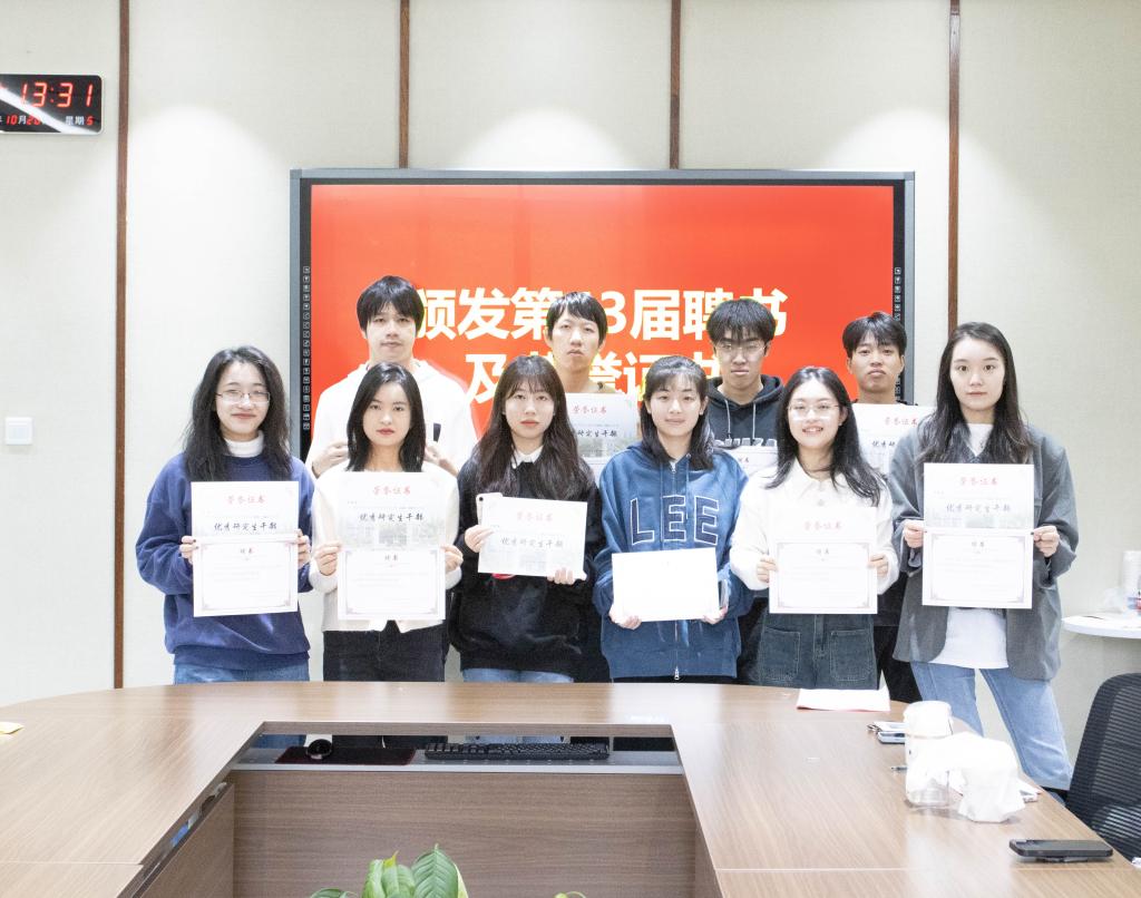 接下来是颁发聘书及荣誉证书环节,在上一年的工作中,研会老成员勇于担当,认真负责,为同学们的生活、学习、发展提供了许多帮助和支持,荣誉证书是一种对他们工作的肯定和鼓励。希望新一届研会成员以他们为榜样,更进一步发扬团结协作、务实创新的优良传统。