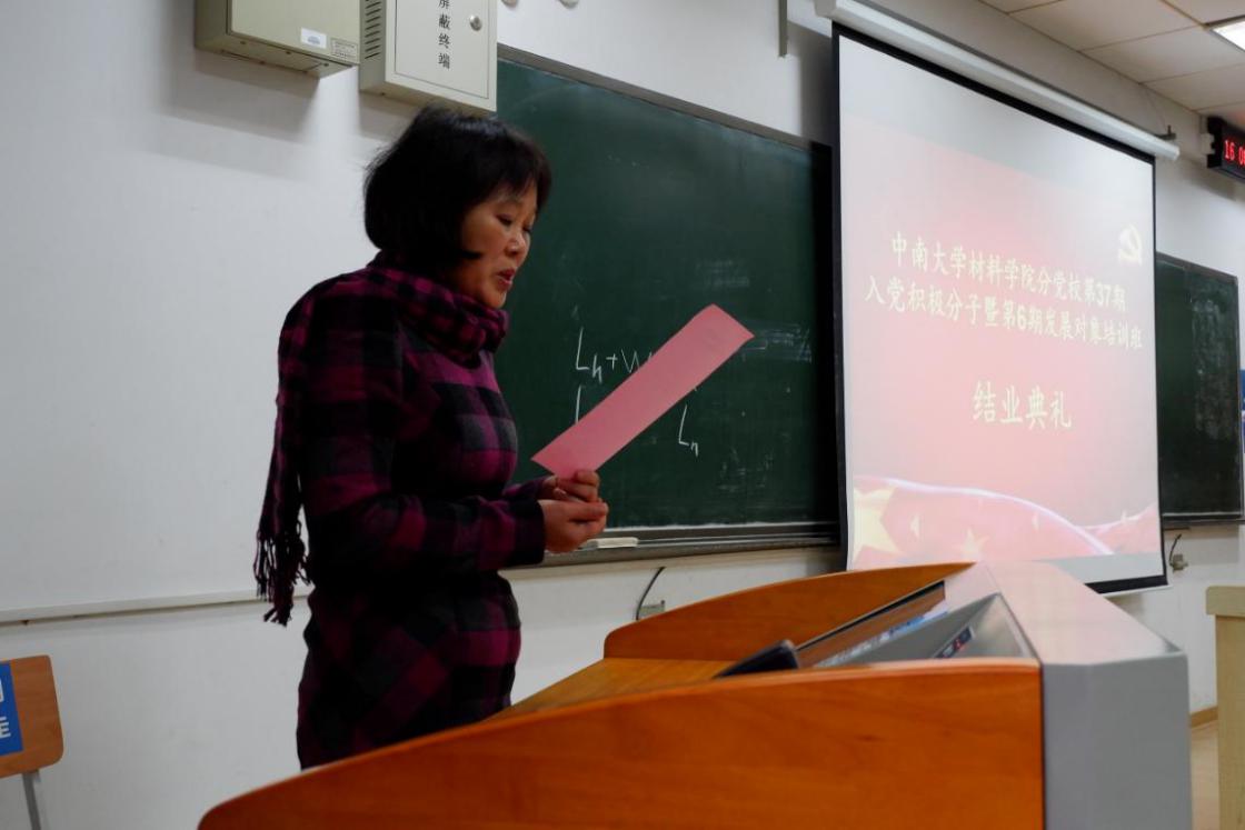 优秀学员代表安欣发言,结合自己平时学习生活分享了本次培训班的心得体验,并谈了自己作为一名积极分子的未来展望和对党全新认识。她表示将在思想上始终以党为指导,端正入党动机,树立为实现共产主义奋斗终生的信念和全心全意为人民谋利益的思想;行动上追随党,在日常工作、学习和生活中起到先锋模范作用,积极为人民服务。同时鼓励在座的同学都能用实际行动兑现自己对人民、对党的承诺。